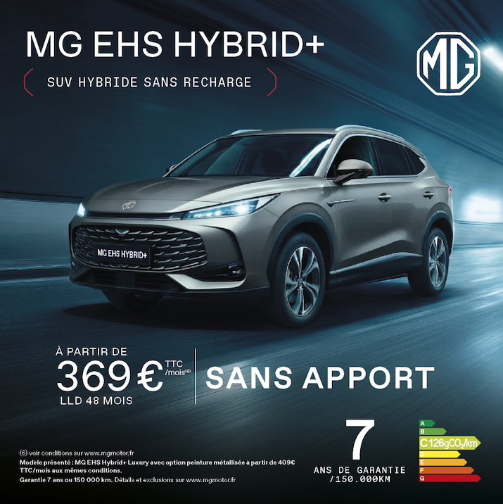 (6) Ex. pour un MG EHS Hybrid+ Standard neuf hors option en Location Longue Durée sur 48 mois et 40 000 km maximum soit 48 loyers mensuels de 369€ TTC. Offre non cumulable réservée aux particuliers pour toute commande d'un véhicule en LLD jusqu'au 31/03/2026 et livré / facturé au plus tard le 30/04/2026, dans la limite des stocks disponibles et dans le réseau participant en France métropolitaine et Corse, sous réserve d’acceptation par DRIVALIA Lease France, SA au capital de 68 954 580,86 €, 1 Rue Victor Basch - 91300 MASSY, 342 499 126 RCS Evry. Intermédiaire d’assurance inscrit à l’ORIAS sous le N° 12 066 654 (www.orias.fr). Modèle présenté : MG EHS Hybrid+ Luxury avec option peinture métallisée : 409€ TTC/mois aux mêmes conditions. Prix TTC excluant les frais de mise à la route. Détails et conditions sur mgmotor.fr