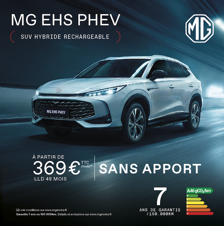 (14) Prix de vente au détail conseillé d’un EHS PHEV Comfort neuf hors option, après déduction de 4000€ TTC d'Avantage Client MG sur le tarif le plus élevé conseillé par le constructeur. Offre valable pour l'achat d'une MG EHS PHEV Comfort neuf livrable au plus tard le 30/04/2026. Offre réservée aux particuliers, du 01/02/2026 au 31/03/2026, dans la limite des stocks disponibles et du réseau MG participant en France métropolitaine et Corse. Plus d'informations auprès de votre concessionnaire MG. Prix TTC excluant les frais de mise à la route. Détails et conditions sur mgmotor.fr