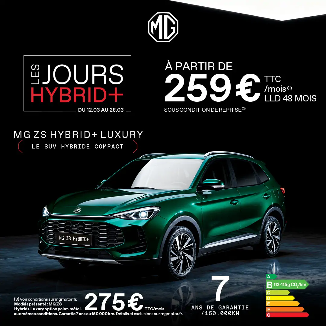 (13) Prix de vente au détail conseillé d’un ZS Hybrid+ Standard neuf hors option, déduction faite de 3500€ de remise totale (incluant 1000 € d'Avantage MG, 1000 € de remise exceptionnelle et 1500 € d'aide à la reprise*). Livrable au plus tard le 26/06/2026. Offre à particuliers valable du 12/03/2026 au 28/03/2026 dans le réseau part. et dans la limite des stocks, sous condition de reprise* d'un véhicule. Hors frais mise à la route. Prix TTC excluant les frais de mise à la route. Détails et conditions sur mgmotor.fr Modèle présenté : ZS Hybrid+ Luxury neuf avec peinture métallisée (à 650€ TTC) dont le prix conseillé est de 24640€ TTC aux mêmes conditions. *reprise d'un véhicule particulier de toute marque, immatriculé au nom du client depuis plus de 3 mois et remis le jour de la livraison, sous réserve d'acceptation par le concessionnaire.