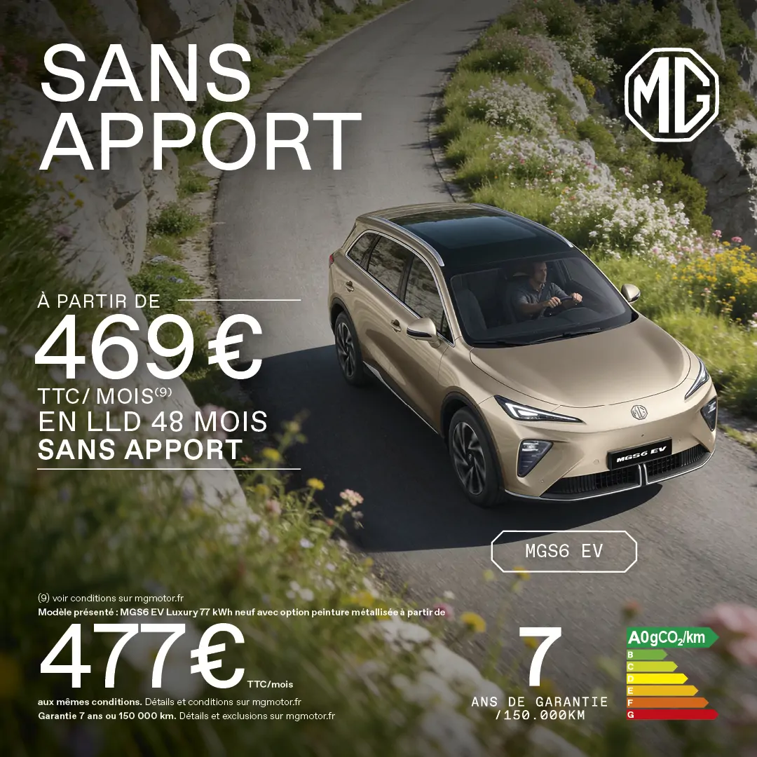 (19a) Prix de vente au détail conseillé d’un MGS6 EV Luxury Dual Motor 77 kWH neuf hors option, après déduction de 3500€ TTC d'Avantage MG sur le tarif le plus élevé conseillé par le constructeur. Offre valable pour l'achat d'un nouveau MGS6 EV Luxury 77 kWh livrable au plus tard le 31/07/2026. Offre réservée aux particuliers, du 01/04/2026 au 30/06/2026, dans la limite des stocks disponibles et du réseau MG participant en France métropolitaine et Corse. Plus d'informations auprès de votre concessionnaire MG. Modèle présenté : MGS6 EV Luxury 77 kWH neuf avec option peinture métallisée dont le prix conseillé est de 42140€ TTC aux mêmes conditions. Hors frais de mise à la route. Détails et conditions sur mgmotor.fr