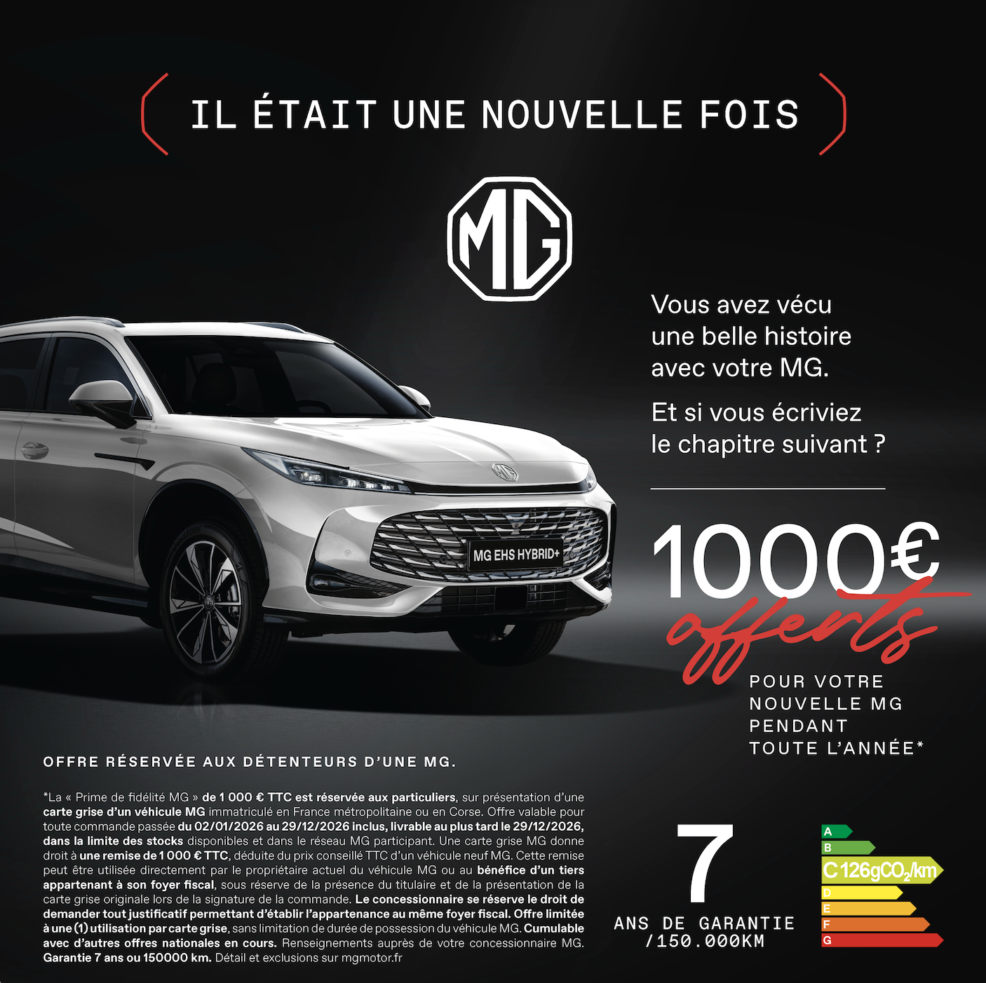 La « Prime de fidélité MG » de 1 000 € TTC est réservée aux particuliers, sur présentation d'une carte grise d'un véhicule MG immatriculé en France métropolitaine ou en Corse. Offre valable pour toute commande passée du 02/01/2026 au 29/12/2026 inclus, livrable au plus tard le 29/12/2026, dans la limite des stocks disponibles et dans le réseau MG participant. Une carte grise MG donne droit à une remise de 1 000 € TTC, déduite du prix conseillé TTC d'un véhicule neuf MG. Cette remise peut être utilisée directement par le propriétaire actuel du véhicule MG ou au bénéfice d'un tiers appartenant à son foyer fiscal, sous réserve de la présence du titulaire et de la présentation de la carte grise originale lors de la signature de la commande. Le concessionnaire se réserve le droit de demander tout justificatif permettant d'établir l'appartenance au même foyer fiscal. Offre limitée à une (1) utilisation par carte grise, sans limitation de durée de possession du véhicule MG. Cumulable avec d'autres offres nationales en cours. Renseignements auprès de votre concessionnaire MG.