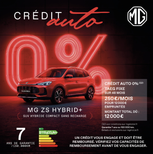 Offre à particuliers valable pour toute commande d'un MG ZS Hybrid+ neuf jusqu’au 31/03/2026 livrée au plus tard le 30/04/2026 dans la limite des stocks disponibles et le réseau participant en France métropolitaine et Corse. Coût total du crédit : 0 € hors assurance facultative. Coût du crédit pris en charge par SAIC Motor France. Taux débiteur fixe : 0%