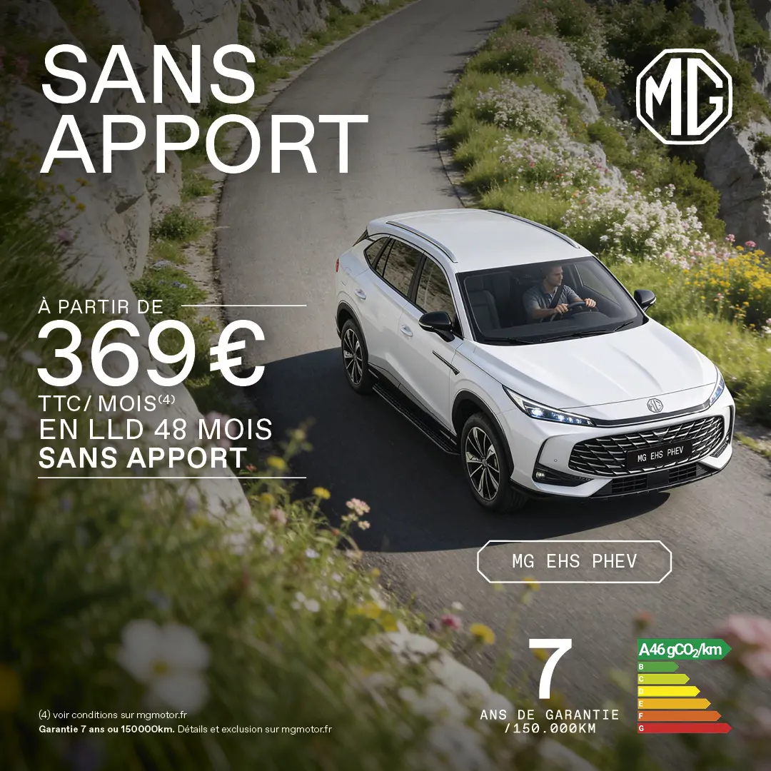 (14) Prix de vente au détail conseillé d’un EHS PHEV Comfort neuf hors option, après déduction de 4000€ TTC d'Avantage MG sur le tarif le plus élevé conseillé par le constructeur. Offre valable pour l'achat d'un MG EHS PHEV Comfort neuf livrable au plus tard le 31/07/2026. Offre réservée aux particuliers, du 01/04/2026 au 30/06/2026, dans la limite des stocks disponibles et du réseau MG participant en France métropolitaine et Corse. Plus d'informations auprès de votre concessionnaire MG. Prix TTC excluant les frais de mise à la route. Détails et conditions sur mgmotor.fr