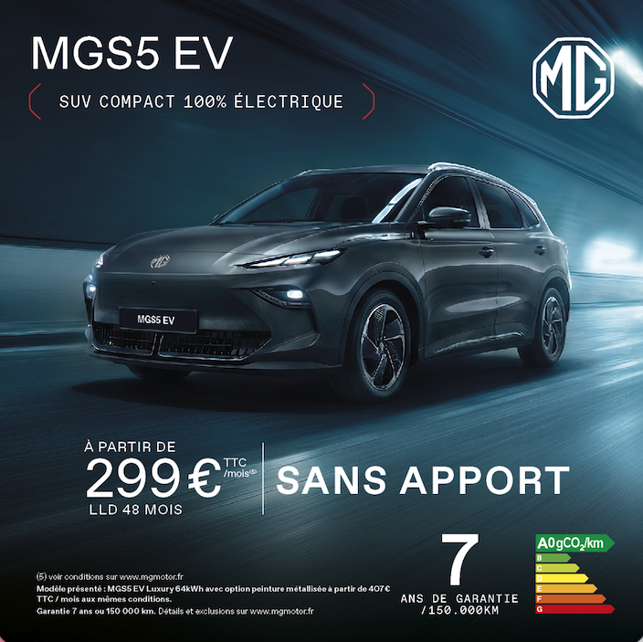 (17) Prix de vente au détail conseillé d’un MGS5 EV Comfort 49kWh neuf hors option, après déduction de 3500€ TTC d'Avantage Client MG sur le tarif le plus élevé conseillé par le constructeur. Modèle présenté : MGS5 EV Luxury 64kWh neuf avec option peinture métallisée dont le prix conseillé est de 35640€ TTC aux mêmes conditions. Offre valable pour l'achat d'un MGS5 EV 49kWh neuf livrable au plus tard le 30/04/2026. Offre réservée aux particuliers, du 01/02/2026 au 31/03/2026, dans la limite des stocks disponibles et du réseau MG participant en France métropolitaine et Corse. Plus d'informations auprès de votre concessionnaire MG. Prix TTC excluant les frais de mise à la route. Détails et conditions sur mgmotor.fr